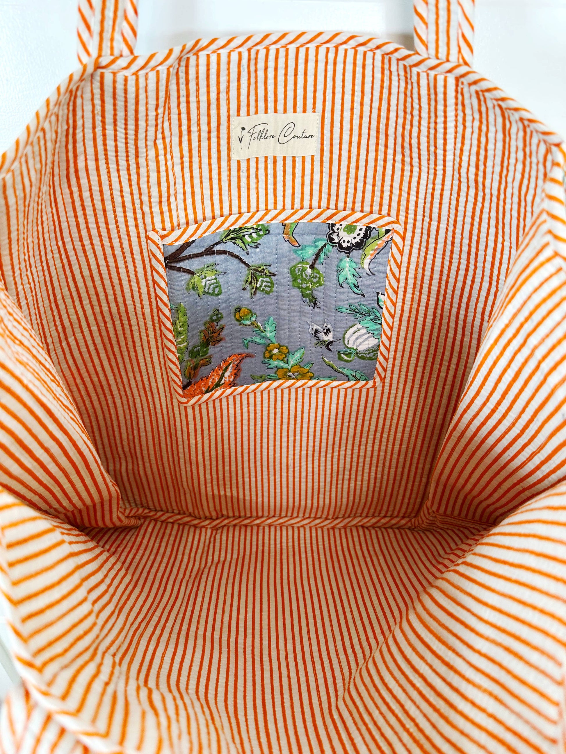 With block printed fabrics, there may be some variations and print placement may vary by bag.