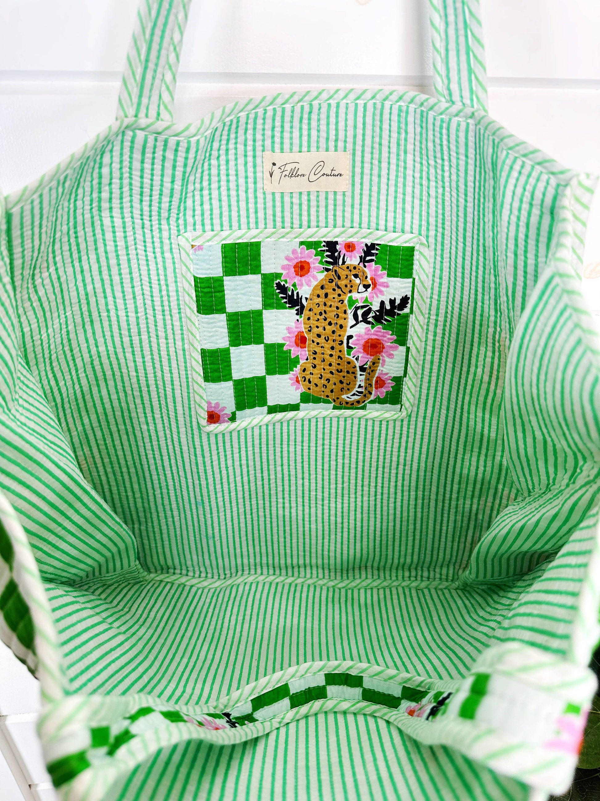 Green Checkered Jaguar Print Oversized Quilted Tote Bag: