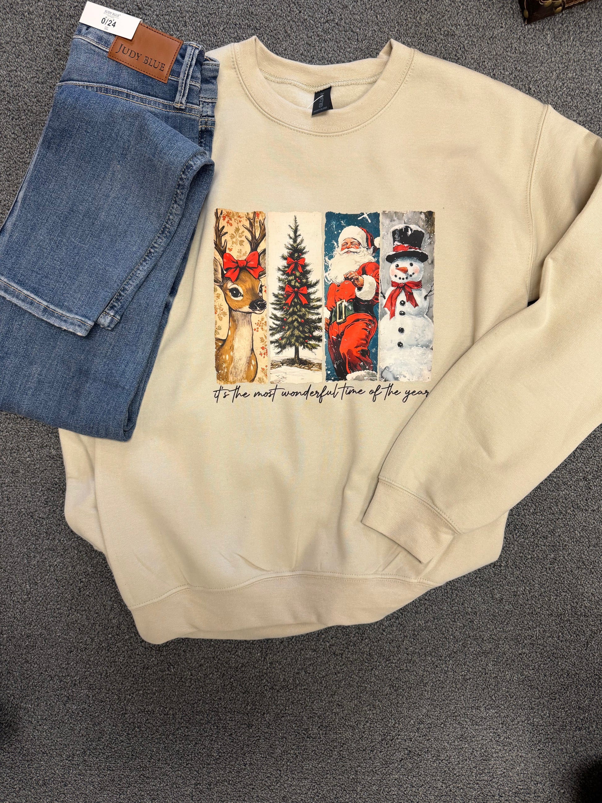 Celebrate the magic of the season in cozy style with this charming holiday sweatshirt! Featuring four nostalgic Christmas panels—a sweet vintage reindeer, a classic tree, Santa himself, and a cheerful snowman—this design brings all your favorite holiday memories together in one festive look. The handwritten script reads “It’s the most wonderful time of the year,” making it the perfect piece for all your merry moments.